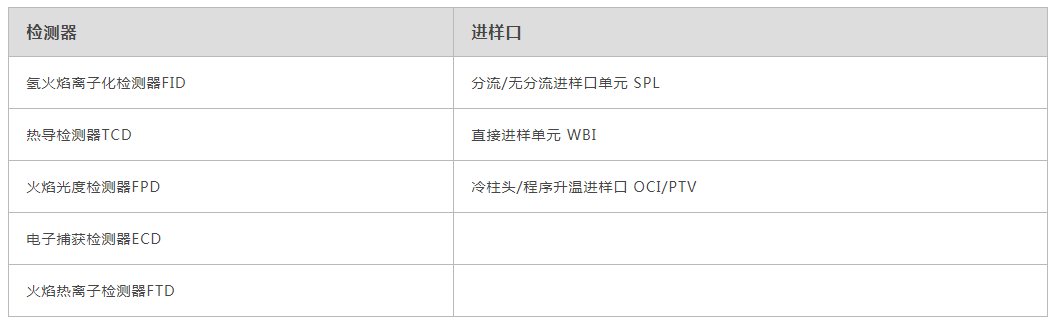 最多可以同時裝載3個進樣單元和4個檢測器,可以為樣品選擇最合適的檢測器和進樣口,而且進行單元切換非常方便。根據(jù)分析目的,共有3種進樣單元和5種檢測器可供選擇。