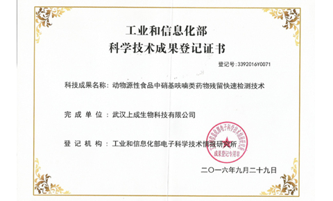 由洪山區(qū)科技局和洪山區(qū)人民政府聯(lián)合主辦的“洪山·嗅鈦Show Time第二屆創(chuàng)新創(chuàng)業(yè)大賽”,上成生物提交的“糧食中黃曲霉毒素B1的快速檢測”經(jīng)過初賽,復(fù)賽,得到評委的一直認(rèn)可,經(jīng)過與其他對手的緊張比拼,最后取得了第三名的好成績。工業(yè)和信息化部科學(xué)技術(shù)成果登記證書