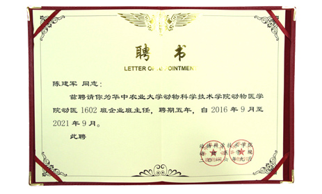 上成生物總經(jīng)理陳建軍同志被華中農(nóng)業(yè)大學(xué)動物科學(xué)技術(shù)學(xué)院動物醫(yī)學(xué)院聘請為1602班企業(yè)班主任,聘期五年。華中農(nóng)業(yè)大學(xué)聘書