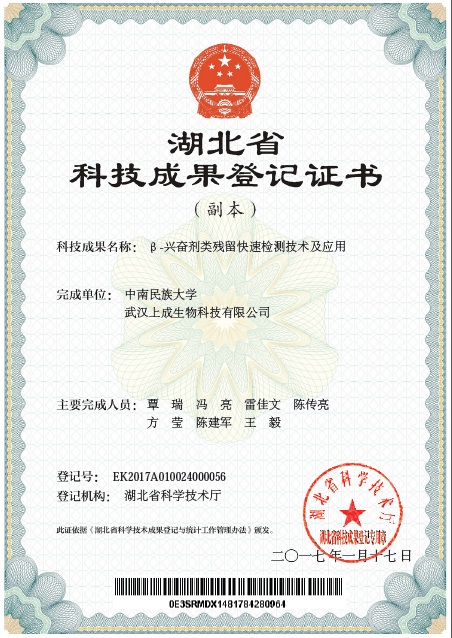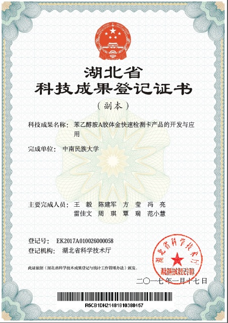 苯乙醇胺A膠體金快速檢測卡產(chǎn)品的開發(fā)與應(yīng)用湖北省科技成果登記證書