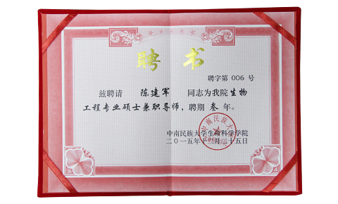 祝賀上成生物總經(jīng)理陳建軍同志被中南民族大學生命科學學院聘請為生物工程專業(yè)碩士兼職導(dǎo)師,聘期叁年。2015年度“洪山好人”