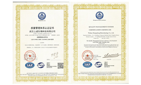武漢上成生物科技有限公司獲得質(zhì)量管理體系認證證書