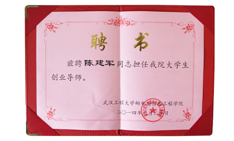 2014年武漢工程大學(xué)郵電與信息工程學(xué)院聘請(qǐng)陳建軍同志擔(dān)任大學(xué)生創(chuàng)業(yè)導(dǎo)師。第九屆洪山區(qū)十大優(yōu)秀青年