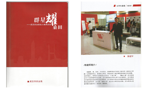 由武漢市農(nóng)業(yè)局編輯出版的“群星耀桑田—武漢農(nóng)業(yè)創(chuàng)業(yè)人物風(fēng)采錄”摘錄了上成生物總經(jīng)理陳建軍的創(chuàng)業(yè)歷程。武漢工程大學(xué)創(chuàng)業(yè)導(dǎo)師
