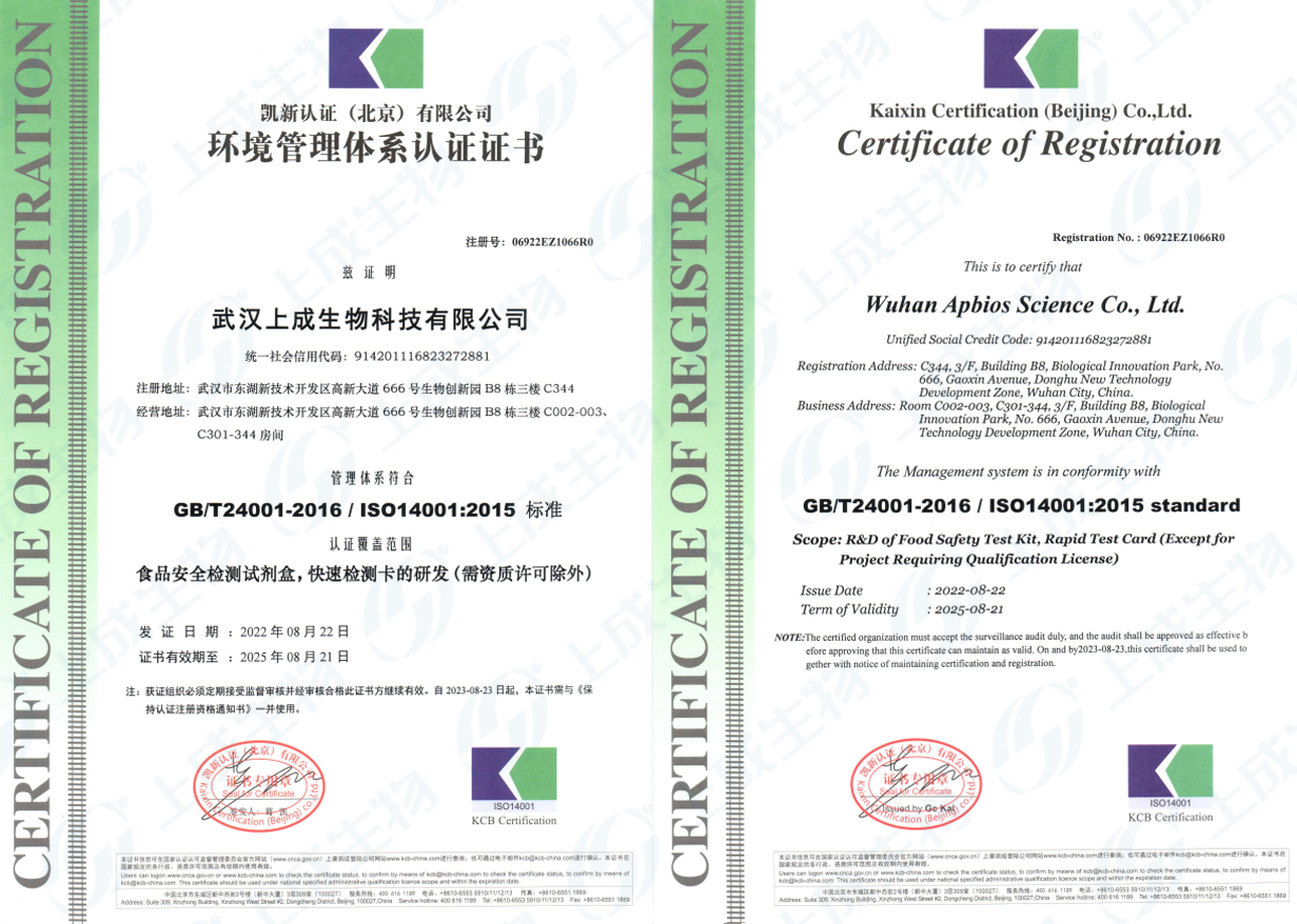 2022年8月22日,武漢上成科技有限公司通過GB/T45001-2020/ISO45001:2018職業(yè)健康安全管理體系認(rèn)證,并順利取得證書。武漢上成生物科技有限公司獲得環(huán)境管理體系認(rèn)證證書