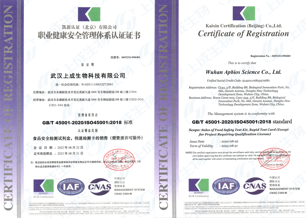 2022年7月10日,上成生物產(chǎn)品苯醚甲環(huán)唑膠體金檢測卡通過農(nóng)業(yè)農(nóng)村部產(chǎn)品質(zhì)量標(biāo)準(zhǔn)研究中心復(fù)核驗證。武漢上成生物科技有限公司獲得職業(yè)健康安全管理體系認(rèn)證證書