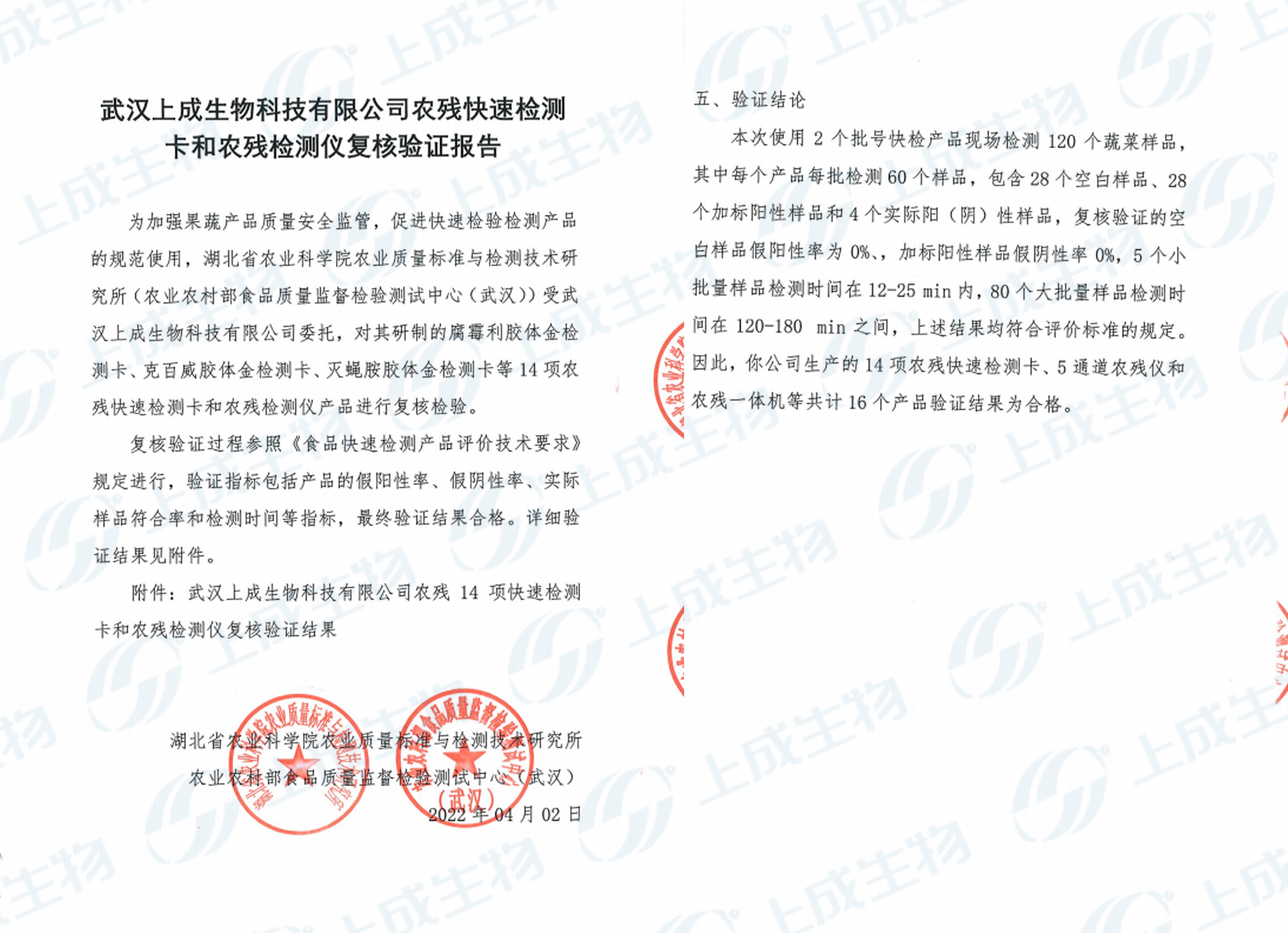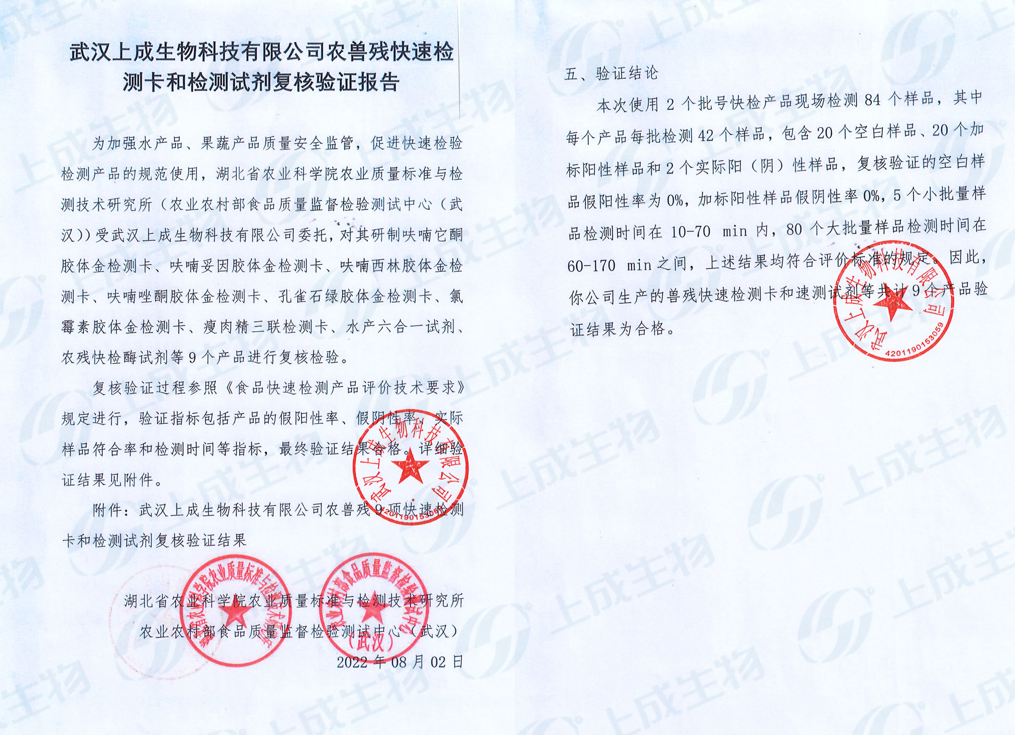 2022.08.02武漢上成生物研制的呋喃它酮代謝物、呋喃妥因代謝物、呋喃西林代謝物、呋喃唑酮代謝物膠體金檢測卡、孔雀石綠膠體金檢測卡、氯霉素膠體金檢測卡、瘦肉精三聯(lián)檢測卡、水產(chǎn)六合一試劑等產(chǎn)品通過農(nóng)業(yè)農(nóng)村部食品質(zhì)量監(jiān)督檢測測試中心符合檢驗,假陽性率為0%。上成生物獲得農(nóng)殘快速檢測卡和農(nóng)殘檢測儀復(fù)核驗證報告