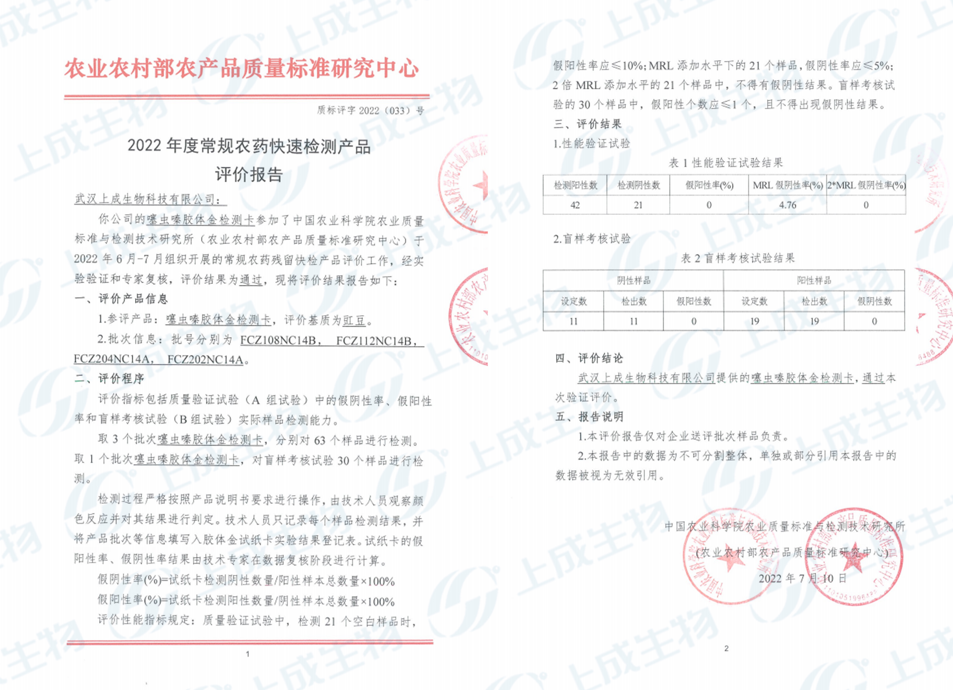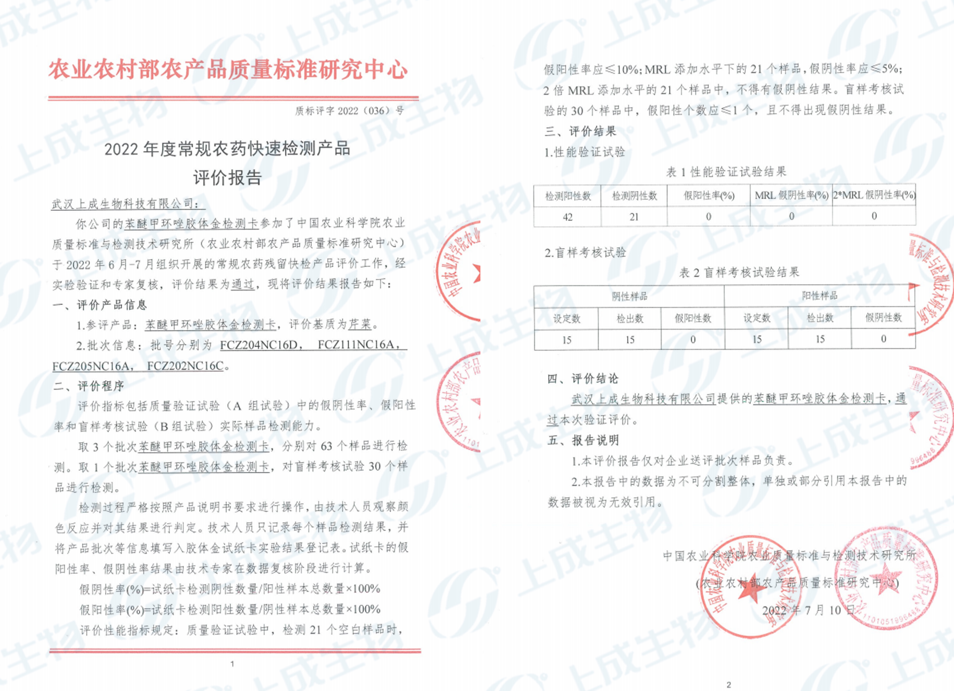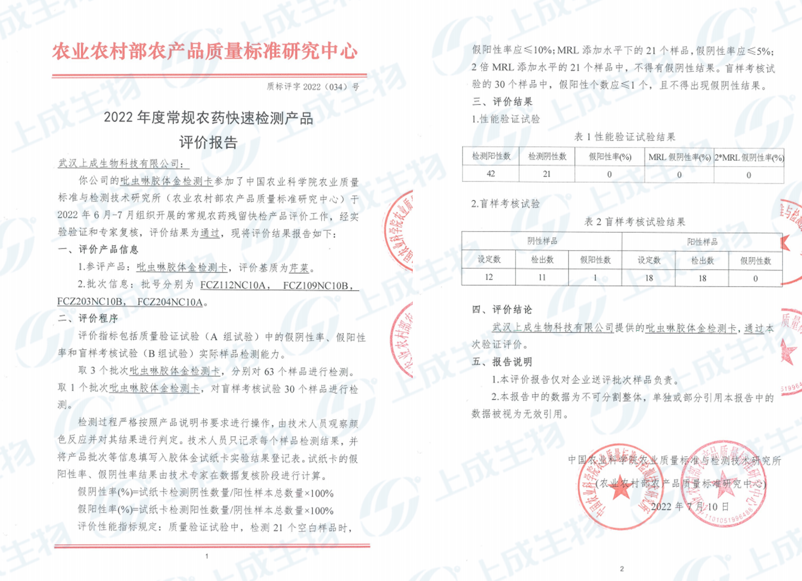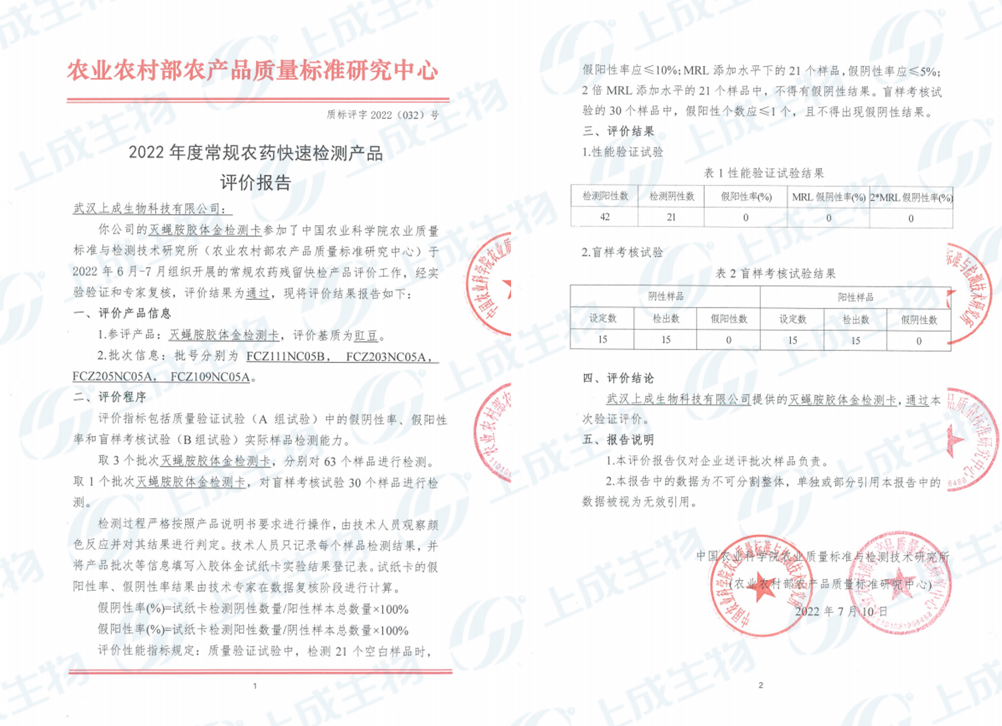 2022年7月10日,上成生物產(chǎn)品吡蟲啉膠體金檢測卡通過農(nóng)業(yè)農(nóng)村部產(chǎn)品質(zhì)量標(biāo)準(zhǔn)研究中心復(fù)核驗證。苯醚甲環(huán)唑膠體金檢測卡通過農(nóng)業(yè)農(nóng)村部復(fù)核檢驗
