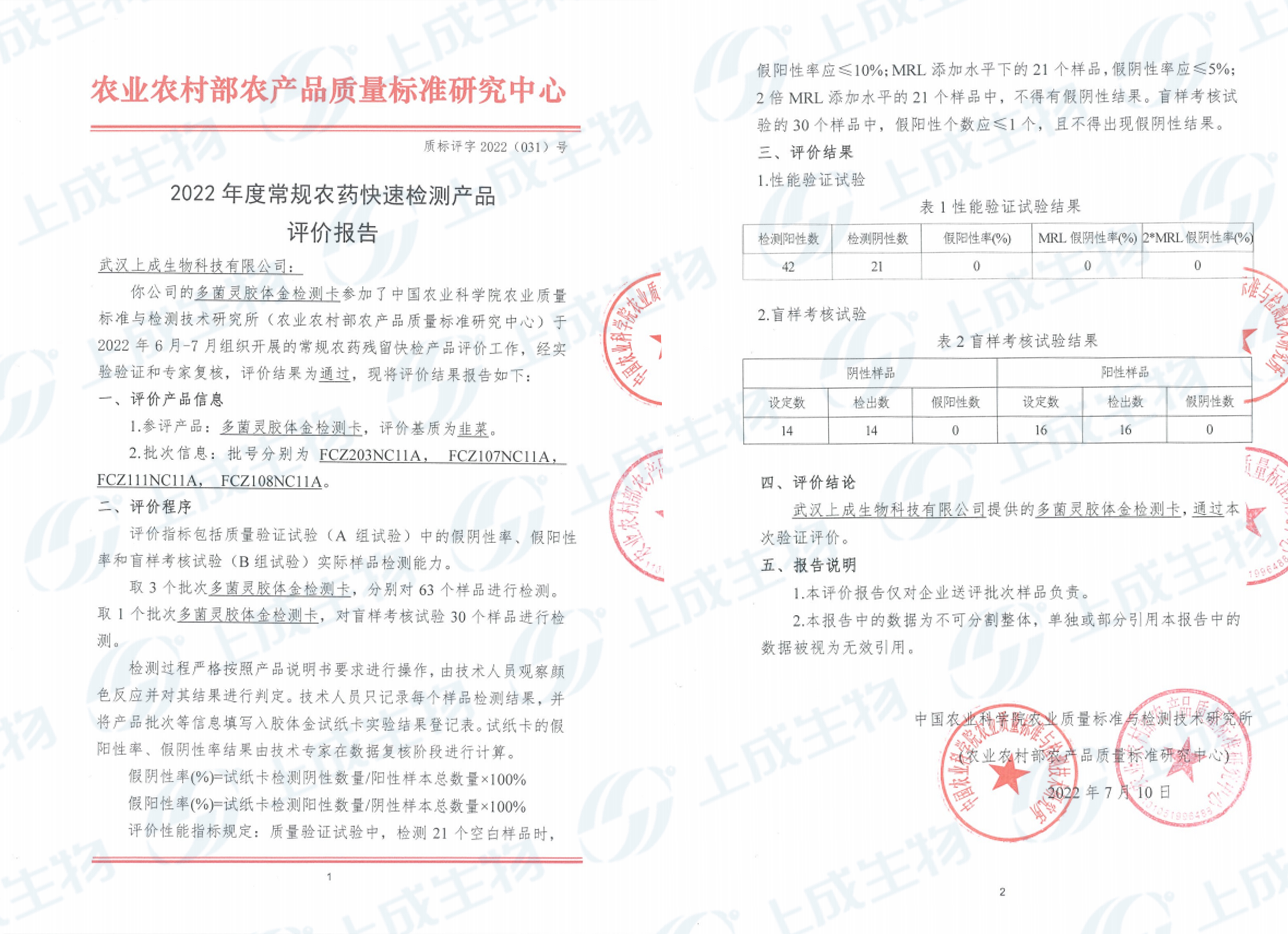 2022年7月10日,上成生物產(chǎn)品多菌靈膠體金檢測卡通過農(nóng)業(yè)農(nóng)村部產(chǎn)品質(zhì)量標(biāo)準(zhǔn)研究中心復(fù)核驗證。吡蟲啉膠體金檢測卡通過農(nóng)業(yè)農(nóng)村部復(fù)核檢驗