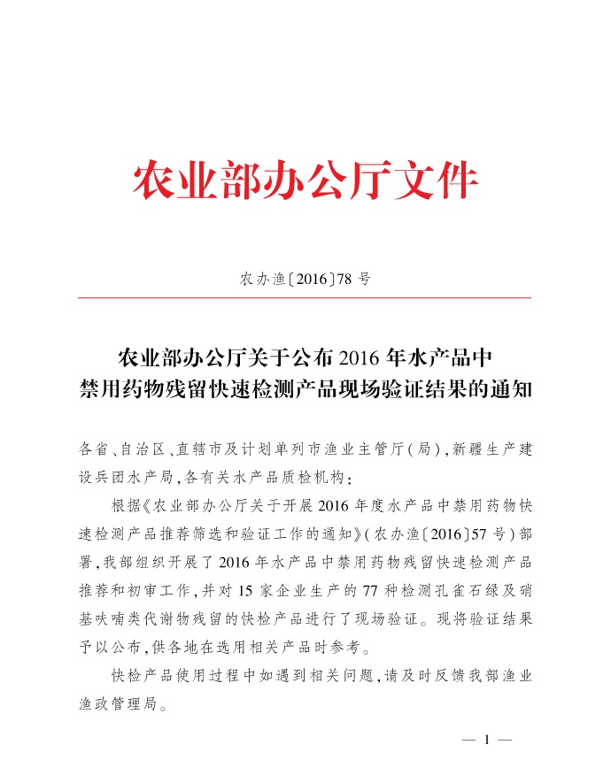 根據(jù)《農(nóng)業(yè)部辦公廳關(guān)于開展2016年度水產(chǎn)品中禁用藥物快速檢測產(chǎn)品推薦篩選和驗證工作的通知》(農(nóng)辦漁〔2016〕57號)部署,農(nóng)業(yè)部組織開展了2016年水產(chǎn)品中禁用藥物殘留快速檢測產(chǎn)品推薦和初審工作,并對15家企業(yè)生產(chǎn)的77種檢測孔雀石綠及硝基呋喃類代謝物殘留的快檢產(chǎn)品進行了現(xiàn)場驗證。