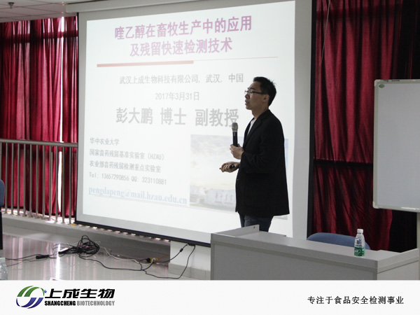 2017年3月31號(hào),在3.15晚會(huì)曝光了喹乙醇新型瘦肉精事件后,上成生物第一時(shí)間,組織員工聯(lián)系客戶,開(kāi)展喹乙醇專業(yè)知識(shí)的培訓(xùn)。同時(shí)我們還邀請(qǐng)到華中農(nóng)業(yè)大學(xué)彭大鵬副教授授課,他作為藥物殘留檢測(cè)方面的專家,先后國(guó)內(nèi)外雜志和論文集上發(fā)表論文57篇。獲授權(quán)和受理的國(guó)家發(fā)明專利50余件,獲得國(guó)家、湖北省、教育部獎(jiǎng)勵(lì)多項(xiàng)。