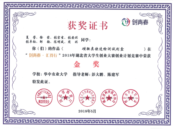 上成生物陳建軍總經(jīng)理作為項(xiàng)目的創(chuàng)業(yè)導(dǎo)師,聯(lián)合華中農(nóng)業(yè)大學(xué)彭大鵬教授等科研團(tuán)隊(duì)參加“創(chuàng)青春?匯得行”2018年湖北省大學(xué)生創(chuàng)業(yè)大賽計(jì)劃競(jìng)賽,其磺胺類快速檢測(cè)試劑盒榮獲金獎(jiǎng)。