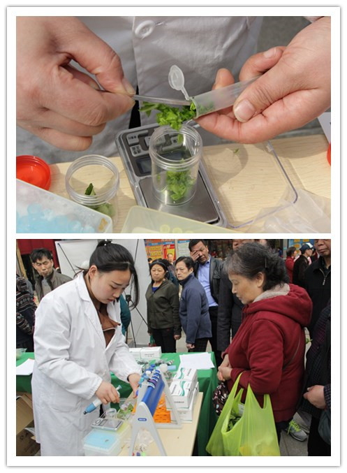 上成生物檢測員利用快檢產(chǎn)品,為社區(qū)群眾檢測日常食用蔬菜的農(nóng)藥殘留,檢測結(jié)果全部合格,眾人紛紛表示可以放心食用。