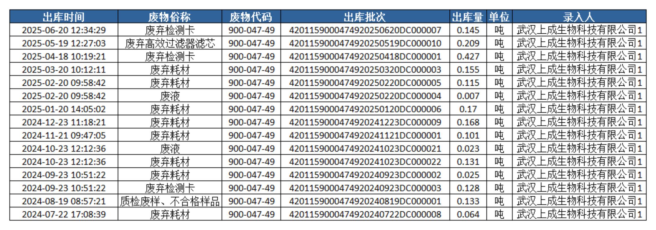 我公司嚴格按照環(huán)評標準委托第三方華新環(huán)境工程(武穴)有限公司進行危廢處理,危廢產生量2噸,處置量2噸。特此公示如下: